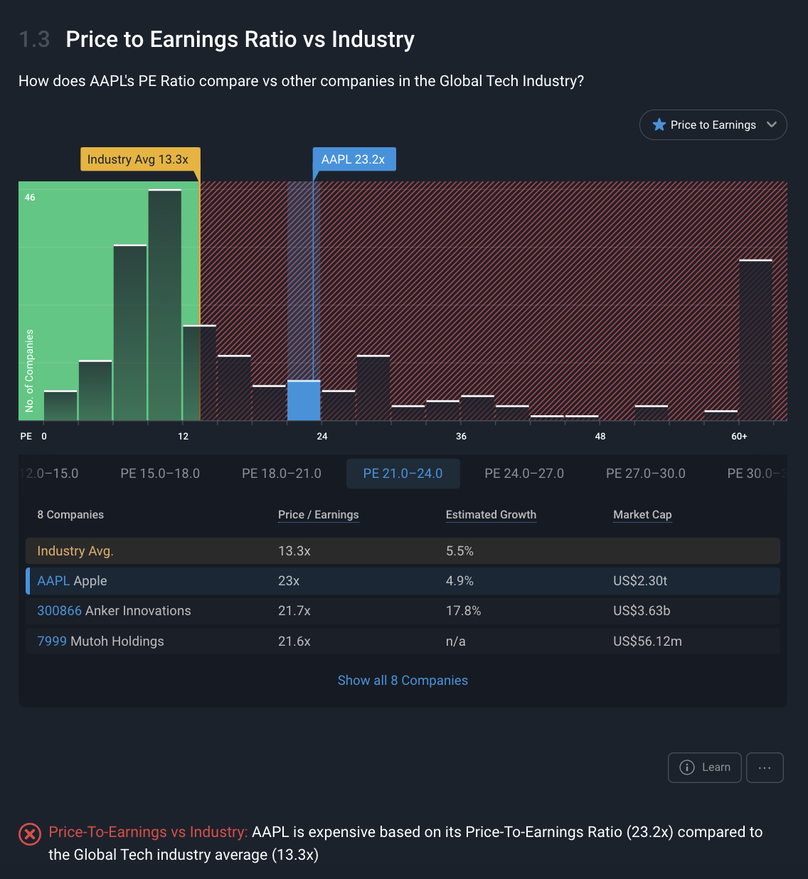 It looks like Apple is almost double the global industry average PE. Additionally, having clicked on those other PE ranges (like 18-21x, and 24-27x), it seems like there are companies with similar prices, but some have much higher expected growth rates.