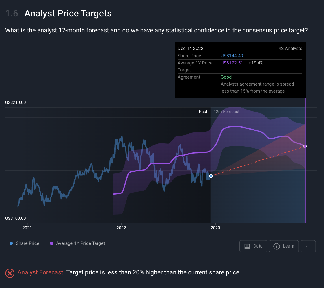 We’d be more interested if it was well above 20%, so in this case, it doesn’t seem like a huge opportunity over the next year. Also, there are some outlier price targets, with low targets of $118 to a high target of $210. Depending on our assumptions of the future (if we assume more or less than 5% annual earnings growth), some of these price targets will make more sense to us than others, and that’s for us to decide.